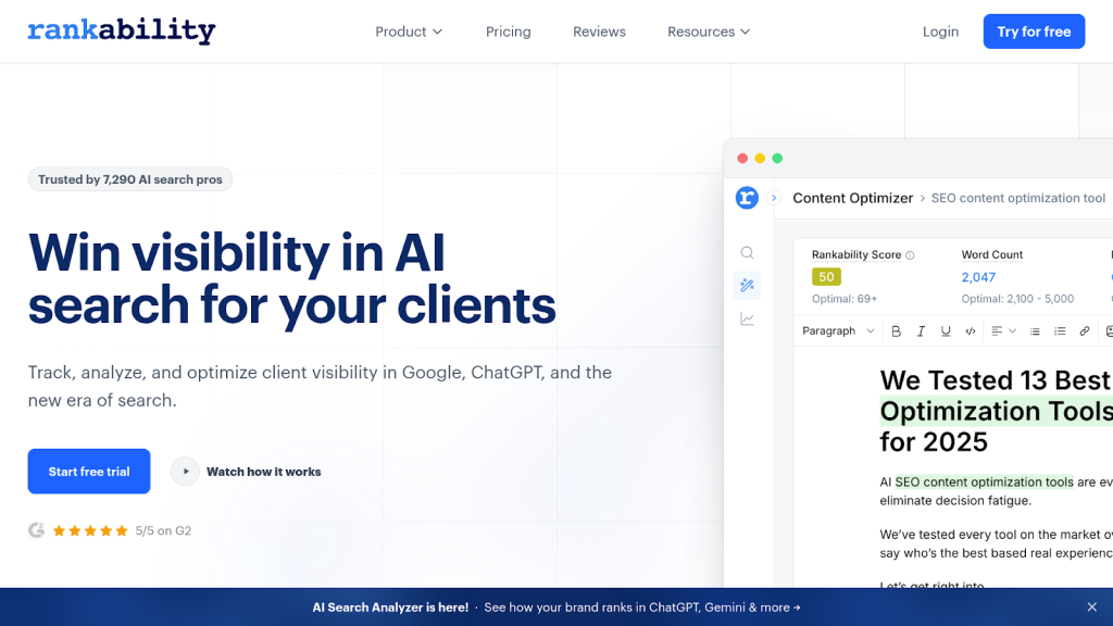 Rankability takes a unique approach by bundling expert coaching calls with its AI visibility and content optimization tools. The combination targets agencies and consultants building GEO expertise.
